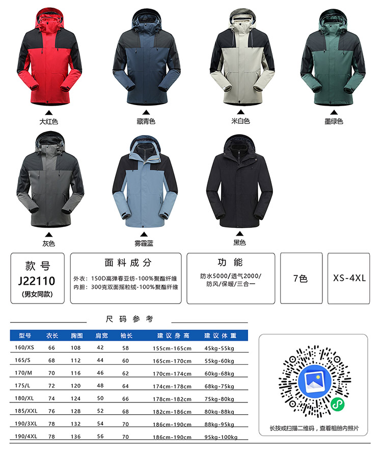 • 外衣:150D高彈春亞紡-100%聚酯纖維內(nèi)膽:300克雙面搖粒絨-100%聚酯纖維防水5000/透氣2000/防風(fēng)/保暖/三合一男女同款沖鋒衣登山服,奧特萊斯定制款防寒保暖情侶套裝沖鋒衣。